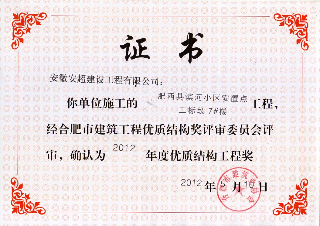 2012年度肥西濱河小區(qū)市優(yōu)質(zhì)結(jié)構(gòu)工程獎